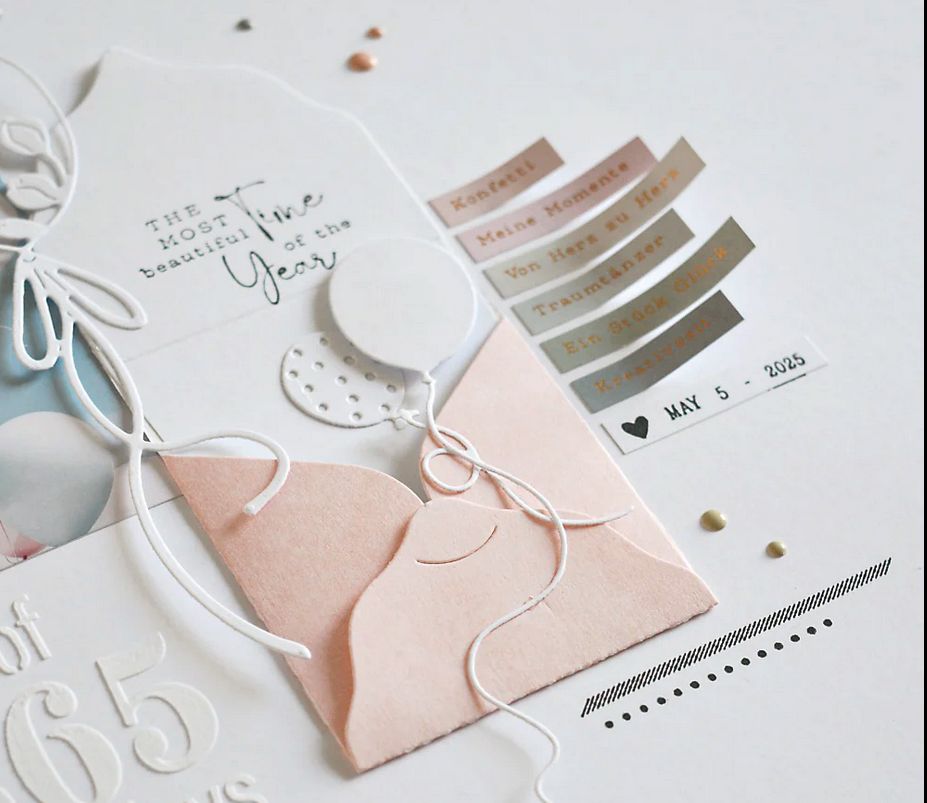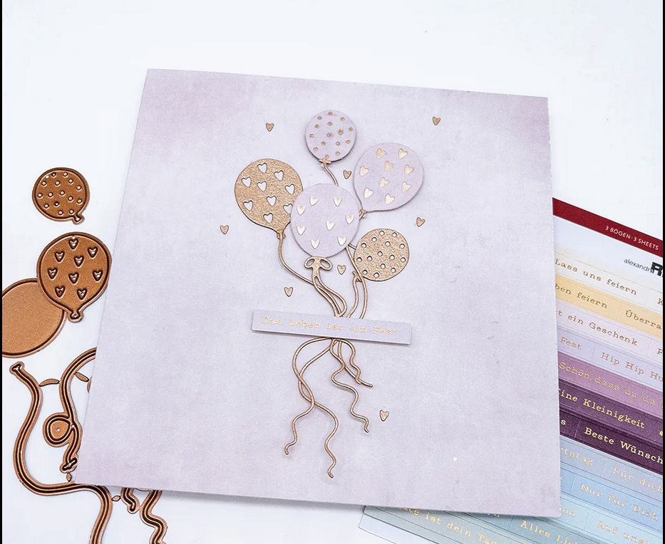 Mit der Motivstanze 'Luftballons mit Schnüren' lassen sich in Kombination mit Papier, Stempeln, wie auch Washi Tapes wundervolle Akzente setzen.