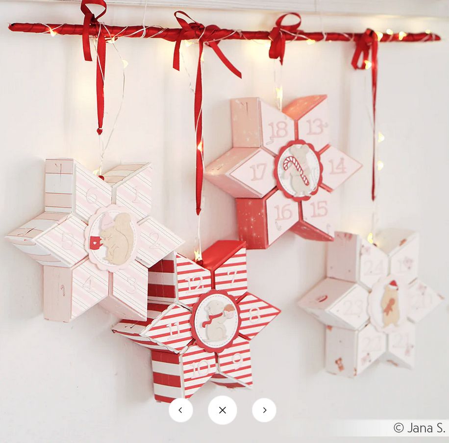Ein tolles Beispiel für einen Adventskalender findet ihr auf der Homepage von alexandraRENKE: https://alexandra-renke.com/blogs/buchbinden-und-schachtelbau/chrissis-adventskalender-sternenglanz